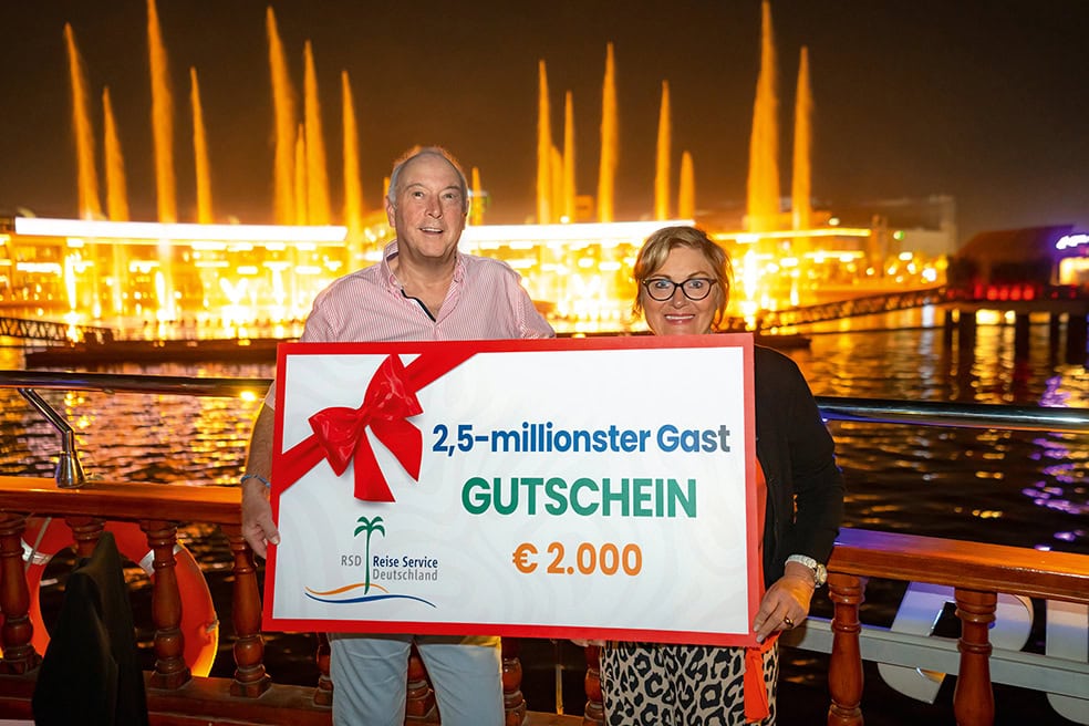 Then Mesut Güvenc reached for the on-board microphone. The RSD representative for the holiday region reported to the guests: In the approximately 16 years since its founding, RSD has shown an incredible 2.5 million guests the most beautiful places around the world. And exactly today and now, these 2.5 millionth guests are present here on board. Namely, Reiner and Annemarie Lipps! Applause broke out, congratulations were given, and the couple were toasted with champagne. They were quite taken aback. “We’ve never been photographed so much before, we were the stars of the evening,” they recall with a smile. And then they really had something to celebrate. Because as an anniversary gift, our RSD representative presented them with a travel voucher worth 2,000 euros.